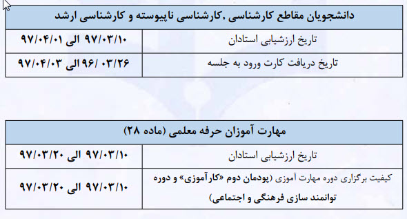 زمان ارزیابی اساتید و دریافت کارت ورود به جلسه امتحان توسط دانشجویان کارشناسی، کارشناسی ناپیوسته و مهارت آموزان(ماده 28) در نیم سال دوم 96 به شرح ذیل می باشد :