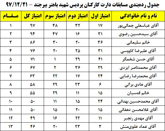 روز سه شنبه مورخ 21 اسفند 97 مسابقه دارت با حضور جمعی از کارکنان پردیس شهید باهنر بیرجند برگزار گردید که در نهایت نتایج زیر به دست آمد :