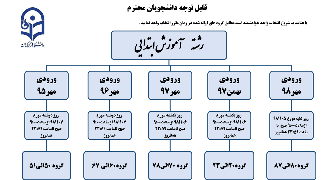 باعنایت به شروع انتخاب واحد خواهشمند است مطابق گروه های ارائه شده در زمان مقرر انتخاب واحد نمایید.