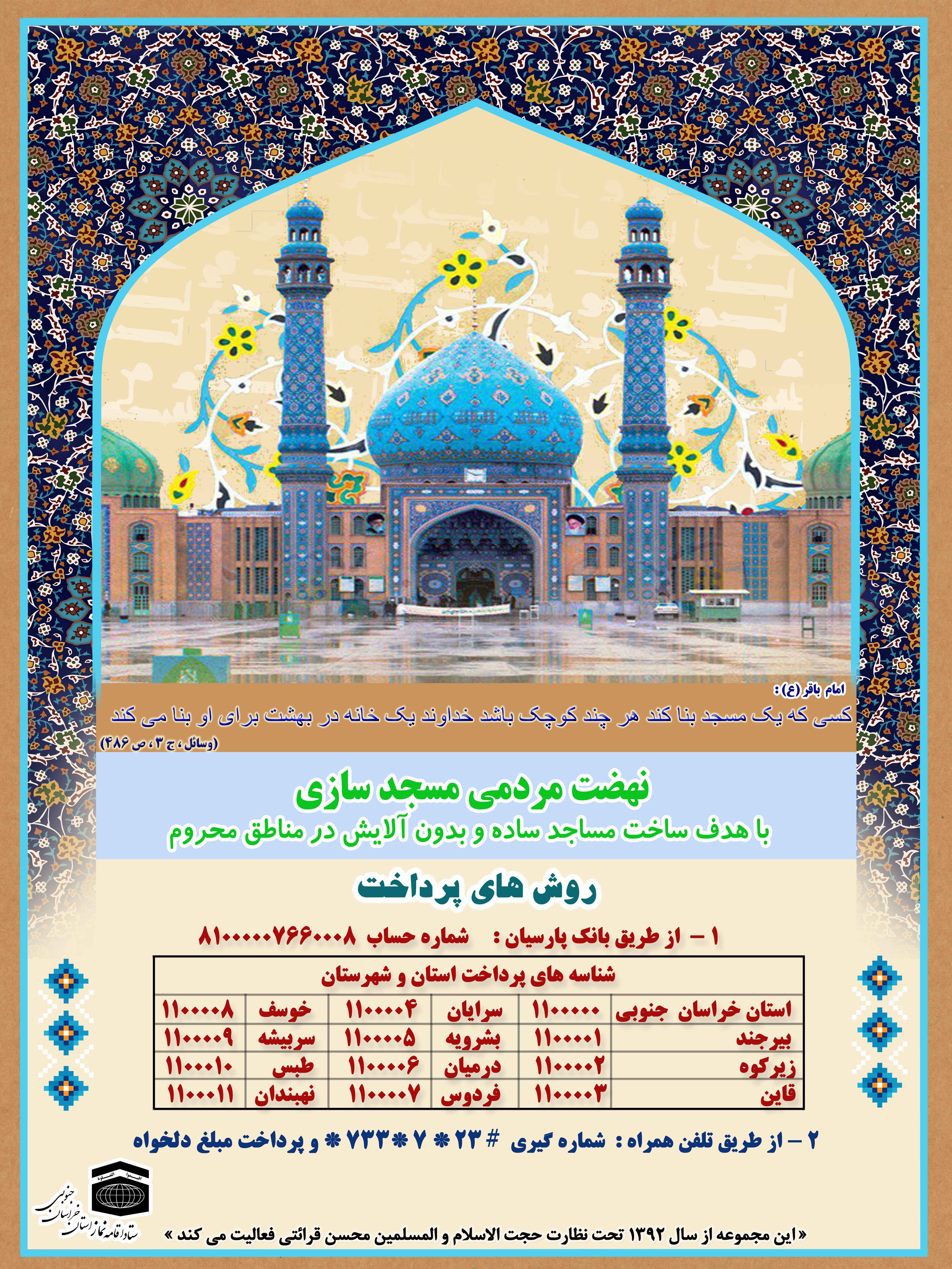 پوستر اطلاع رسانی نهضت مسجد سازی با شناسه پرداخت شهرستانی جهت مشارکت تقدیم می گردد.