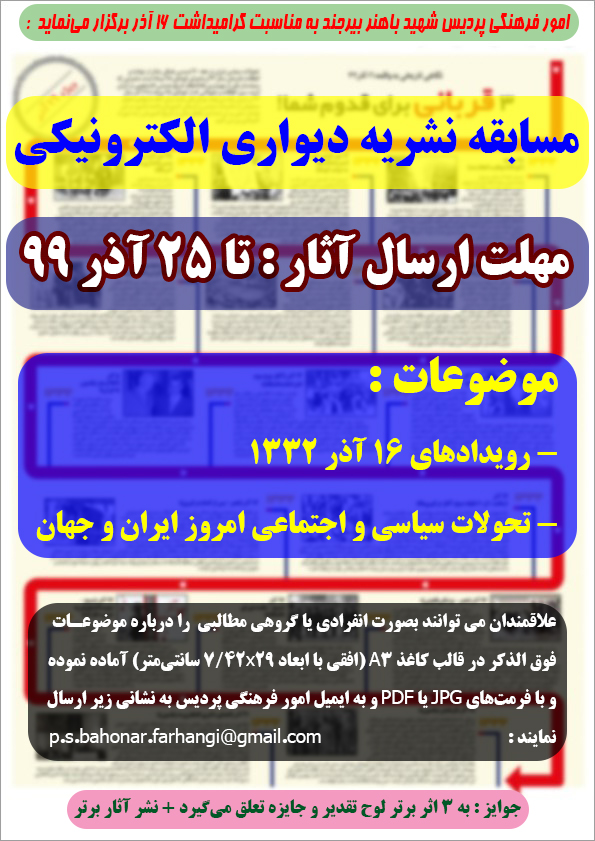 علاقمندان می توانند بصورت انفرادی یا گروهی مطالبی را در موضوع فوق الذکر در قالب کاغذ A3 (افقی با ابعاد 42x29/7 سانتیمتر) آماده نموده و با فرمتهای JPG یا PDF و به ایمیل امور فرهنگی پردیس به نشانی زیر ایمیل نمایند :