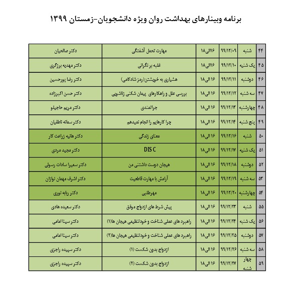 لینک مشاهده وبینارهای برگزار شده : http://counselling.ut.ac.ir/fa/news/13962