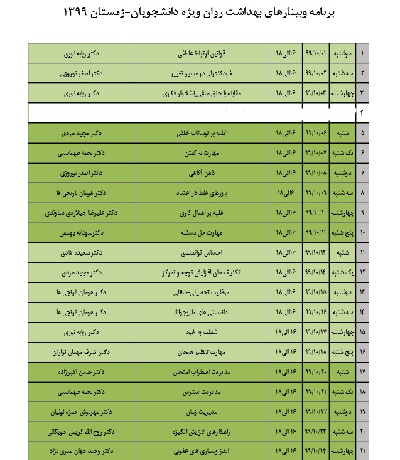 به اطلاع دانشجومعلمان عزیز میرساند ، دفتر مشاوره و سلامت سازمان اموردانشجویان وزارت علوم، تحقیقات و فناوری با مشارکت مرکز مشاوره دانشگاه تهران در ادامه آموزش های فصلی در نظر دارد در راستای ؛ کارگاه های آموزشی آنلاین با هدف ارتقاء بهداشت روان (دوره زمستان 99) ویژه دانشجویان دانشگاه های کشور را با حضور اساتید برجسته کشوری و به صورت رایگان برگزار نماید.