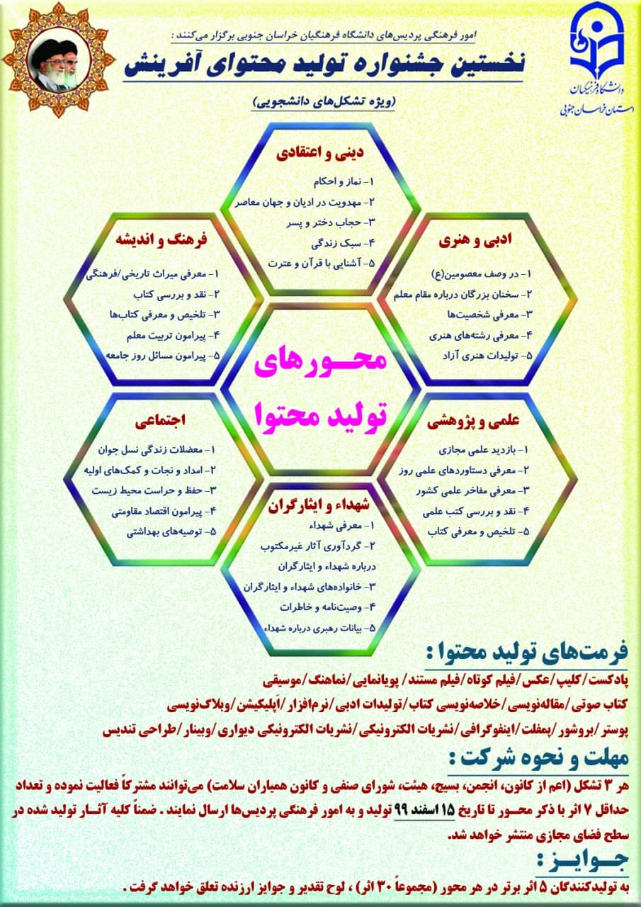 هر 3 تشکل دانشجویی اعم از (کانونهای فرهنگی ، انجمنهای علمی ، هیئت مذهبی ، کانون همیاران سلامت ، بسیج دانشجویی و شورای صنفی) میتوانند مشترکاً (و یا جداگانه) به تعداد حداقل 7 اثر ، تولید محتوا نموده و ضمن نشر در کانالها به امور فرهنگی پردیسها ارسال نمایند.
