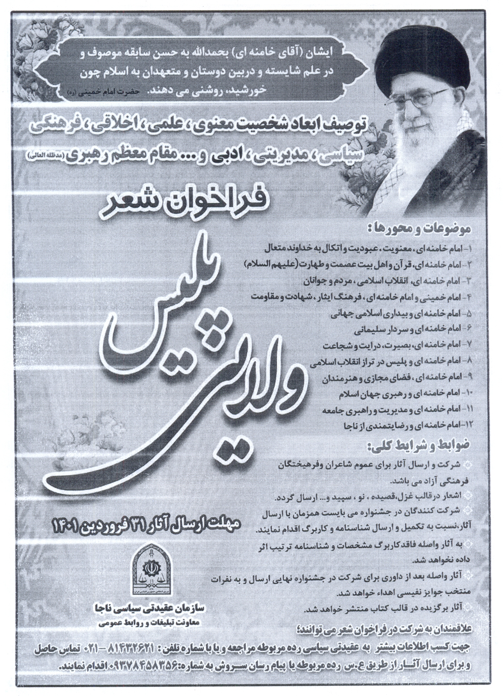 فراخوان شعر پلیس ولایی : توصیف ابعاد شخصیت معنوی، علمی، اخلاقی، فرهنگی، سیاسی، مدیریتی، ادبی و ... مقام معظم رهبری (مدظله العالی)