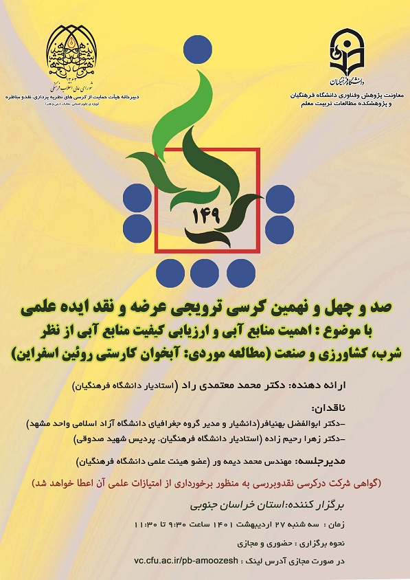 کرسی ترویجی 149 با موضوع: اهمیت منابع آبی و ارزیابی کیفیت منابع آبی از نظر شرب، کشاورزی و صنعت (مطالعه موردی: آبخوان کارستی روئین اسفراین)