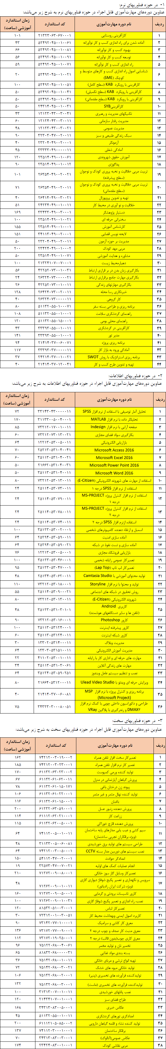 بند 3) رشته های فنی و حرفه ای موجود در نظام نامه: چنانچه تمایل به گذراندن دوره هایی بجز دو دوره فوق الذکر دارید، میتوانید با ارائه لیستی متشکل از تعداد حداقل 14 تن از دانشجومعلمان علاقمند به شرکت در یکی از رشتههای زیر به امور فرهنگی پردیس مراجعه نموده و درخواست برگزاری دوره مزبور را مطرح نمایید. همچنین اگر رشتهای بجز رشته های زیر مد نظرتان است، امکان برگزاری وجود دارد.