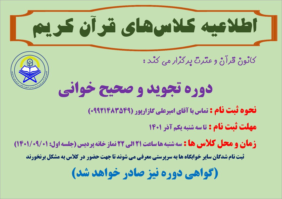 برگزاری دوره آموزش تجوید و صحیح خوانی قرآن کریم