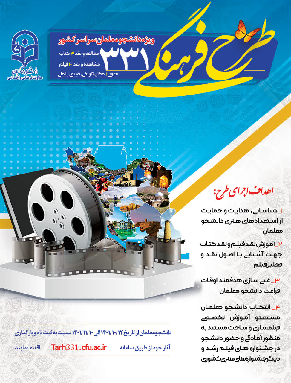 معاونت فرهنگی و اجتماعی سازمان مرکزی در نظر دارد با هدف غنا بخشیدن به فعالیتهای فرهنگی و اوقات فراغت دانشجو معلمان، طرح 331 را باهدف ارتقای دانش تفکر انتقادی و آشنایی با اصول حرفهای نقد فیلم و کتاب و همچنین کشف استعدادهای دانشجو معلمان در حوزههای نویسندگی، کارگردانی، ساخت فیلم کوتاه و مستند برگزار نماید.
