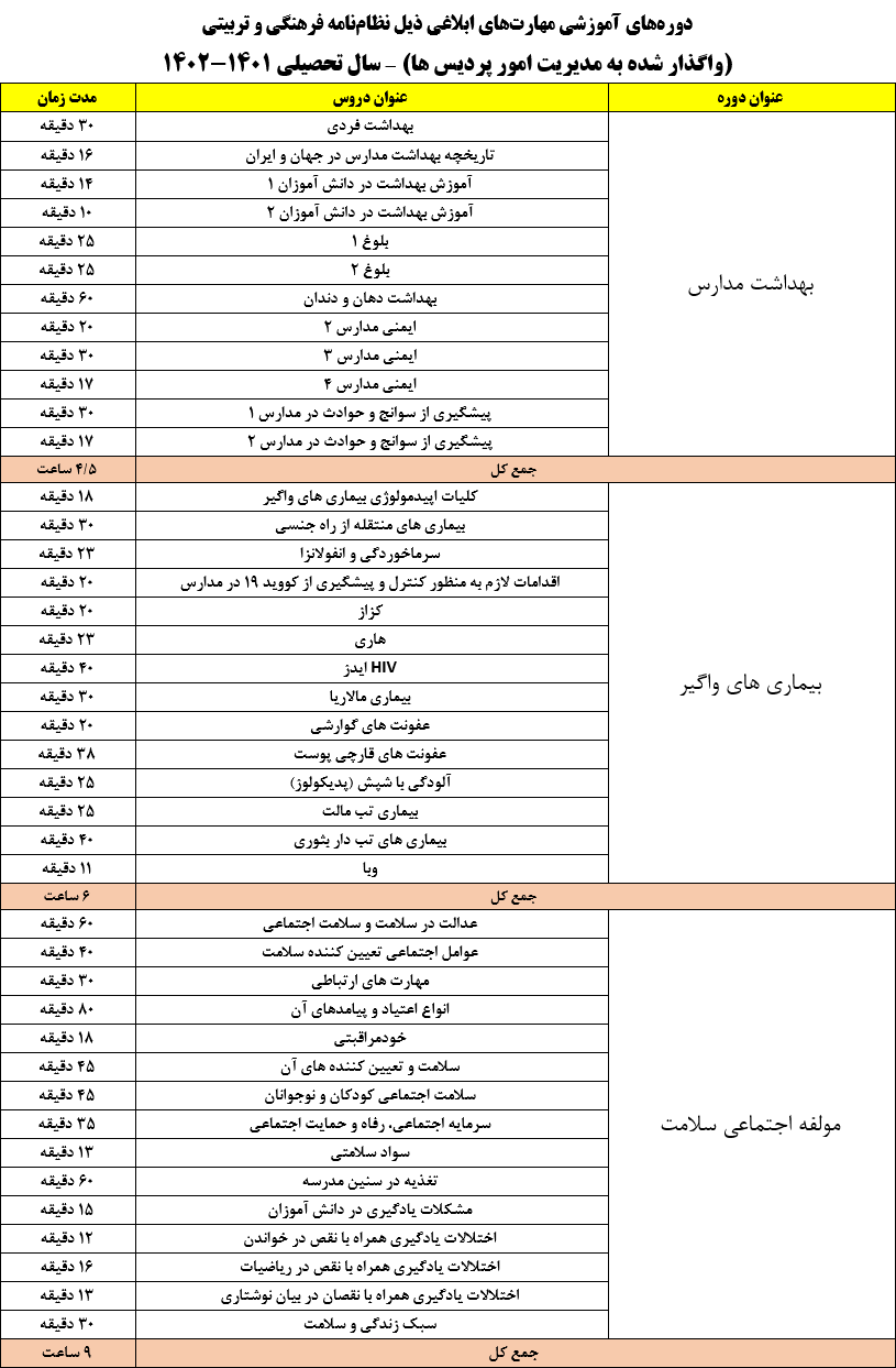 به اطلاع می رساند دوره آموزشی مهارت "فرهنگ سلامت" از بخشنامه "نظام نامه فرهنگی" که برای عموم دانشجومعلمان گذراندن و اخذ مدرک آن الزامی است، بصورت آزمون تستی برگزار خواهد گردید و به افرادی که موفق به کسب نمره قبولی بشوند، گواهی ضمن خدمت به مدت 32 ساعت تعلق خواهد گرفت.