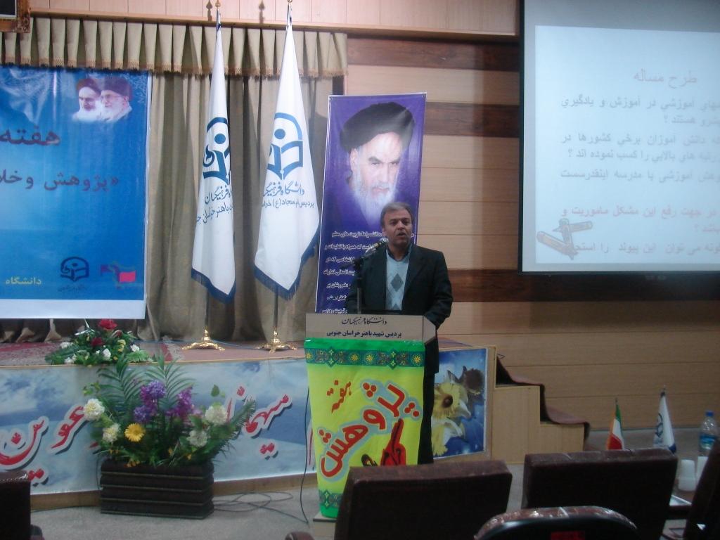 جلسه گرامیداشت هفته پژوهش درپردیس شهید باهنر دانشگاه فرهنگیان خراسان جنوبی درسومین روز از این هفته دوشنبه25 آذر، که به عنوان روز مرجعیت علمی، اقتدار علمی است از ساعت 9 الی 11صبح در سالن اجتماعات این پردیس برگزارشد . این جلسه با مشارکت دوپردیس خواهران وبرادران دانشگاه فرهنگیان استان و با حضور اساتید ، مسئولین ودانشجومعلمان پردیسهای ، شهید باهنر(برادران) وخواهران امام سجاد (ع) خراسان جنوبی برگزار گردید. سخنران این جلسه استاد ایرج مهدی زاده از محققیق وپژوهشگران کشوری واستانی وعضو هیئت علمی پردیس شهید باهنر ابتدا هفته پژوهش و فناوری را با توجه به شعار اساسی هفته پژوهش«پژوهش و خلاقیت، کلید تحول در تربیت»به همه دانش پژوهان ، نخبگان ومحققان بویژه همکاران گران قدر و دانشجو معلمان تلاشگر در دانشگاه فرهنگیان تبریک گفته و از خداوند، توفیق خدمت به این جمع مؤثر در عرصه ی تربیت را طلب کردندودر ادامه فرمودند: