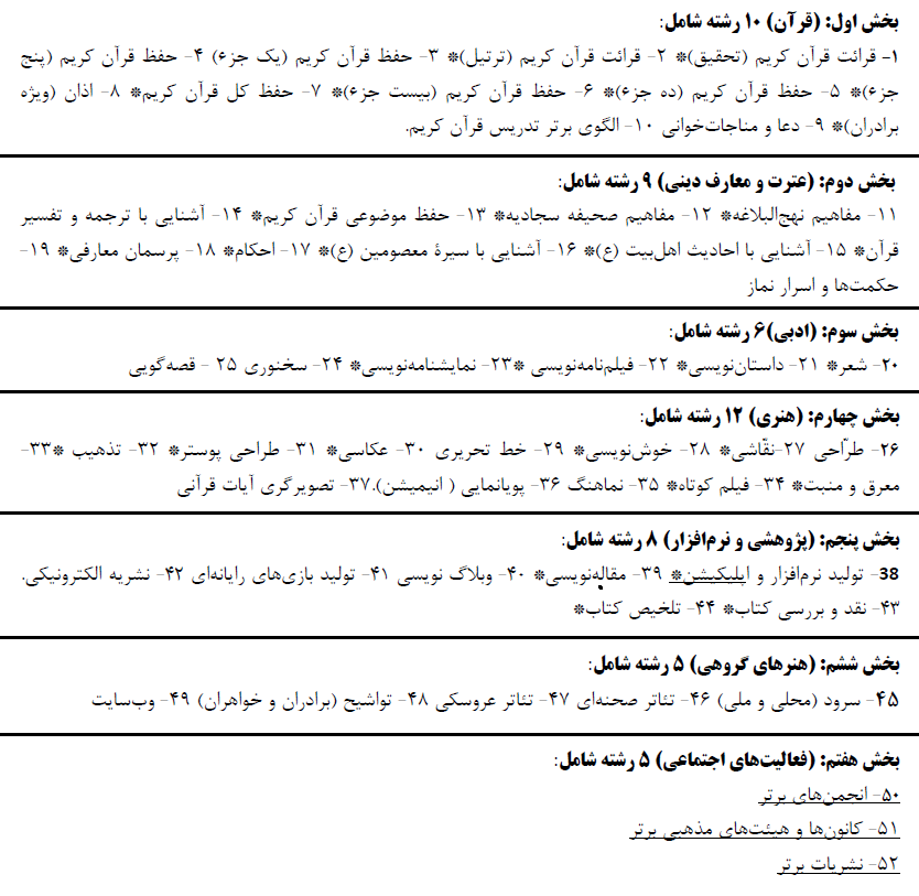 بیست و هفتمین جشنواره فرهنگی دانشگاه فرهنگیان در هفت بخش شامل رشته های ذیل برگزار خواهد شد :