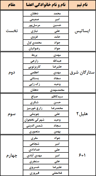 در این رقابت هیجان انگیز که با استقبال پرشور دانشجومعلمان مواجه شده بود 6 تیم متشکل از 7 از بازیکن با هم به رقابت پرداختند که در پایان تیم های ذیل حائز رتبه های برتر این رقابت شدند :