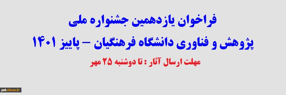 امتیاز دهید : فراخوان یازدهمین جشنواره ملی پژوهش و فناوری دانشگاه فرهنگیان - پاییز 1401 3 جمعه 15 مهر 1401 ساعت 13:59