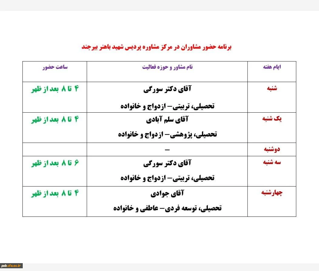 ساعت حضور مشاوران در پردیس شهید باهنر 2